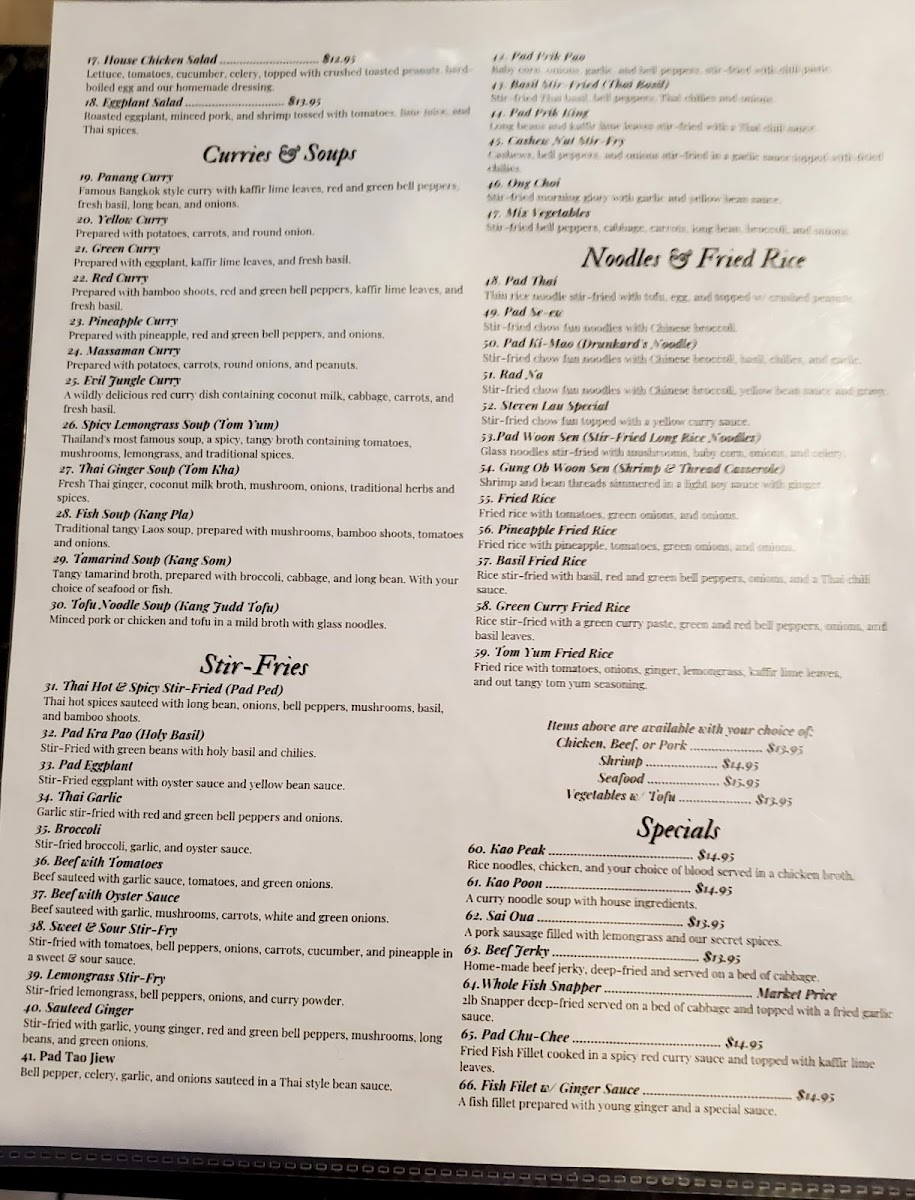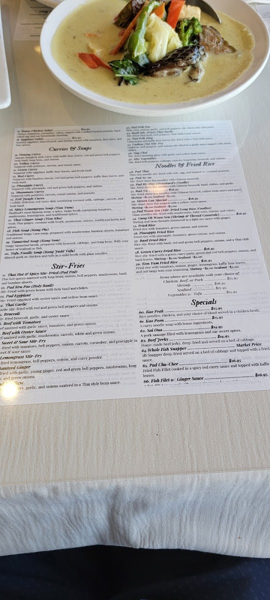 Specials: The specials highlight signature soups and main courses like Sukiyaki Soup with glass noodles and choice of beef or seafood, Khao Soi—a northern Laos soup served with chow fun noodles and minced pork, and Deep Fried Fish with red curry sauce on a bed of cabbage. These dishes provide hearty options suitable for a main meal.