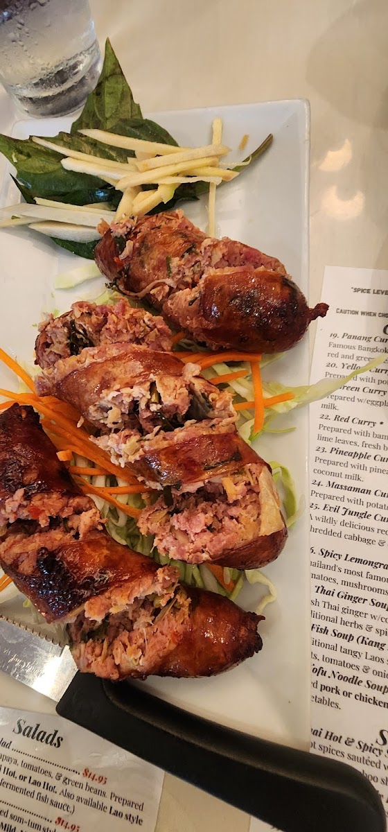 The menu features a diverse selection of dishes representing Thai, Laotian, and Vietnamese cuisines. It is organized into several key categories, allowing guests to explore a variety of flavors and preparations.